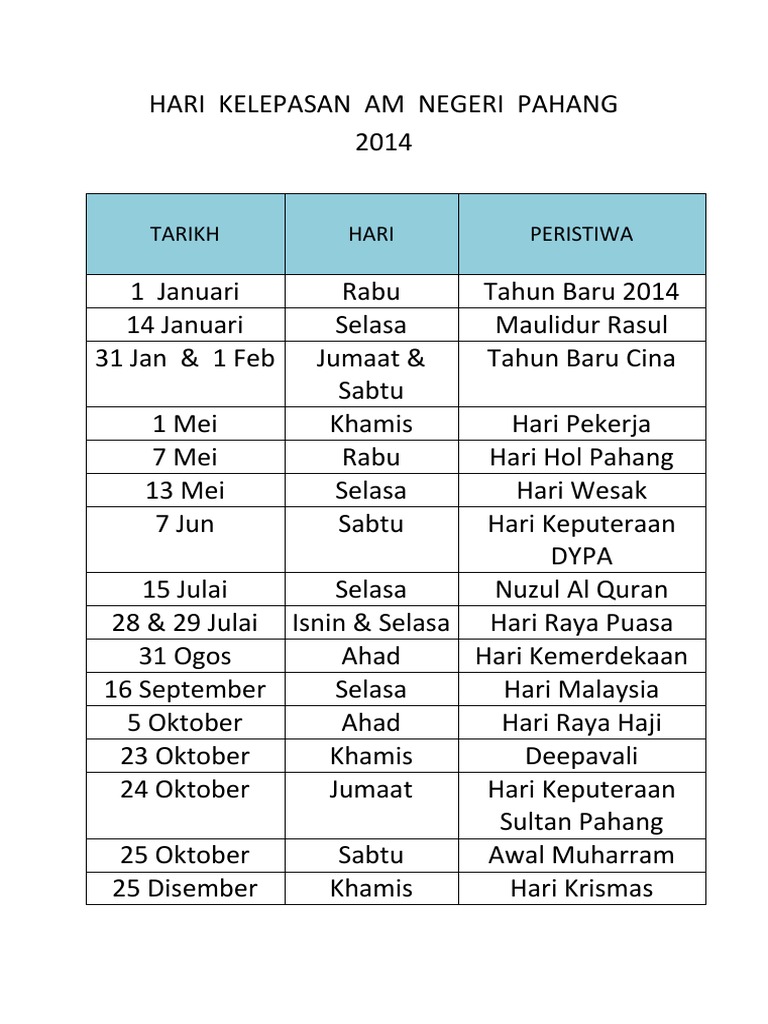 ##harga boleh dirunding lagi jika. Masa ini lah korang kena start check cuti umum tahun depan dan rancang percutian korang untuk tahun depan. Last updated ( monday, 14 october 2019 ). Banyak tempat menarik terdapat di pahang seperti pantai cherating, pantai teluk cempedak, taman negara endau rompin. Kalender cuti 2017 jadual cuti umum di malaysia. State holidays 2017 (jadual hari cuti kelepasan am negeri). Laman ini mengandungi kalendar cuti umum untuk tahun 2019 di malaysia. Terdapat 14 cuti umum nasional yang akan ada pada tahun 2021. Perhatian buat warga pahang yang ingin mengetahui jadual cuti umum dan cuti sekolah negeri pahang darul makmur tahun 2020. Kalendar cuti umum malaysia 2019. Negeri pahang adalah negeri terbesar di semenanjung malaysia dengan kuantan adalah ibu negeri. Semoga kalender cuti umum 2017 dan takwim cuti sekolah 2017 ini dapat membantu anda dalam membuat perancangan awal percutian keluarga seperti memilih destinasi, menyediakan bajet, membeli tiket penerbangan, menempah hotel dan sebagainya. Sultan of pahang's birthday (hari keputeraan sultan pahang).