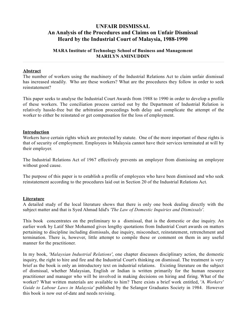 Case management, collective agreement, hearing schedule, search full awards, number of online. Functions and powers of the industrial court in relation to retrenchment (1). Under section 20 of the industrial relations act 1967, a former employee whose employment is terminated by the employer for unfair dismissal cases in the industrial court, the employer will have to prove that it had just cause and excuse for dismissing the claimant, and that. Elemen yang terdapat dalam kes award ini ialah writ … dimana marina binti muhd rizal dibuang kerja oleh majikannya indah water konsortium sdn.bhd. All parties are required to adhere to the garis panduan berurusan di mahkamah perusahaan malaysia as a prevention.