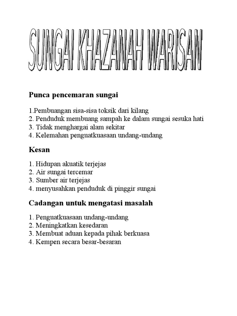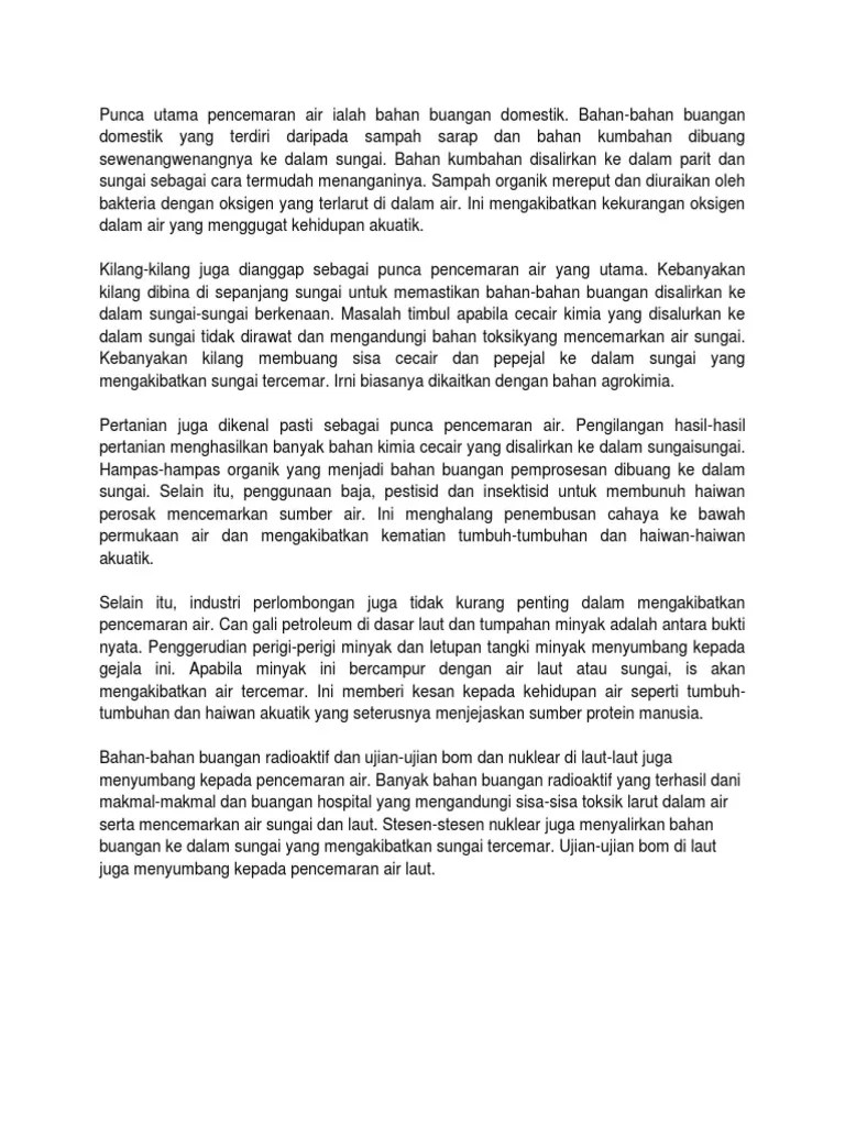 Punca Pencemaran Sungai from imgv2-1-f.scribdassets.com Tindakan tidak bertanggungjawab penduduk terutama penghuni perumahan setinggan yang membuang sampah sarap telah menyebabkan pencemaran air yang serius. Karangan berpandu 3 doc leong hou kit j2f 36 karangan berpandu 3 punca punca pencemaran alam sekitar tema pencemaran alam sekitar kks punca punca course hero Punca, kesan dan langkah pencegahan. Pencemaran ini dikaitkan dengan larutan pelbagai bahan kimia toksik dan bahan buangan. Kini banyak punca air kita tercemar sehingga didapati bahawa jika tiada sebarang langkah diambil ia mungkin memudaratkan kehidupan manusia. Pantai pantai yang dipenuh dengan sampah sarap menjengkelkan dan tidak indah untuk dipandang. Selain itu juga sisa buangan kilang ini juga sangat berbahaya kepada manusia dan hidupan air sehingga boleh mengancam nyawa dan kepupusan spesies. Air merupakan anugerah yang tidak ternilai dan juga merupakan salah satu keperluan asas yang penting kepada manusia.